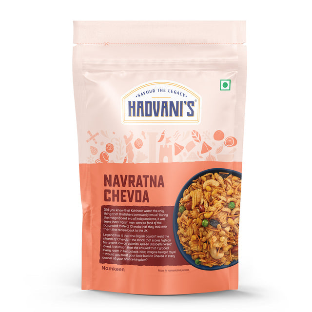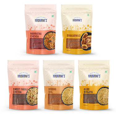 Hadvani’s Indian Namkeen Combo Pack, 5 Variety Snacks Combo for Family & Gifting, Aloo Bhujiya 400gm, Navratna Chevda 400g, Bhakarwadi 400 g, Moong Dal 400 g & Sweet Farali Chevda 400g, Pack of 5